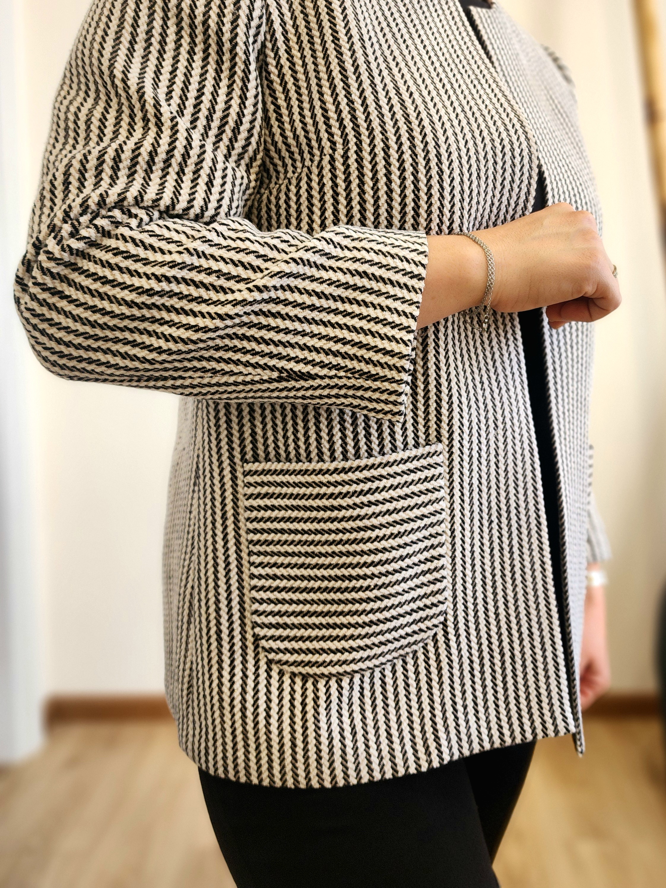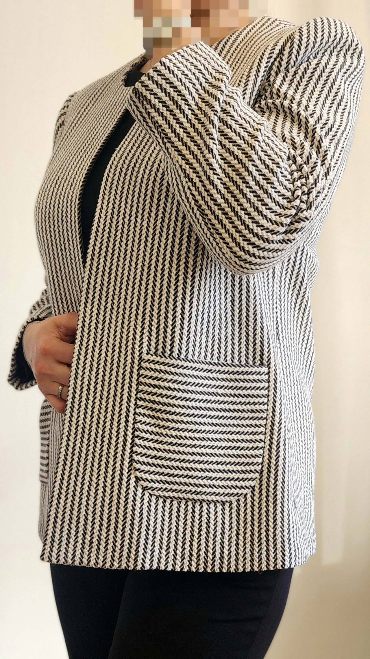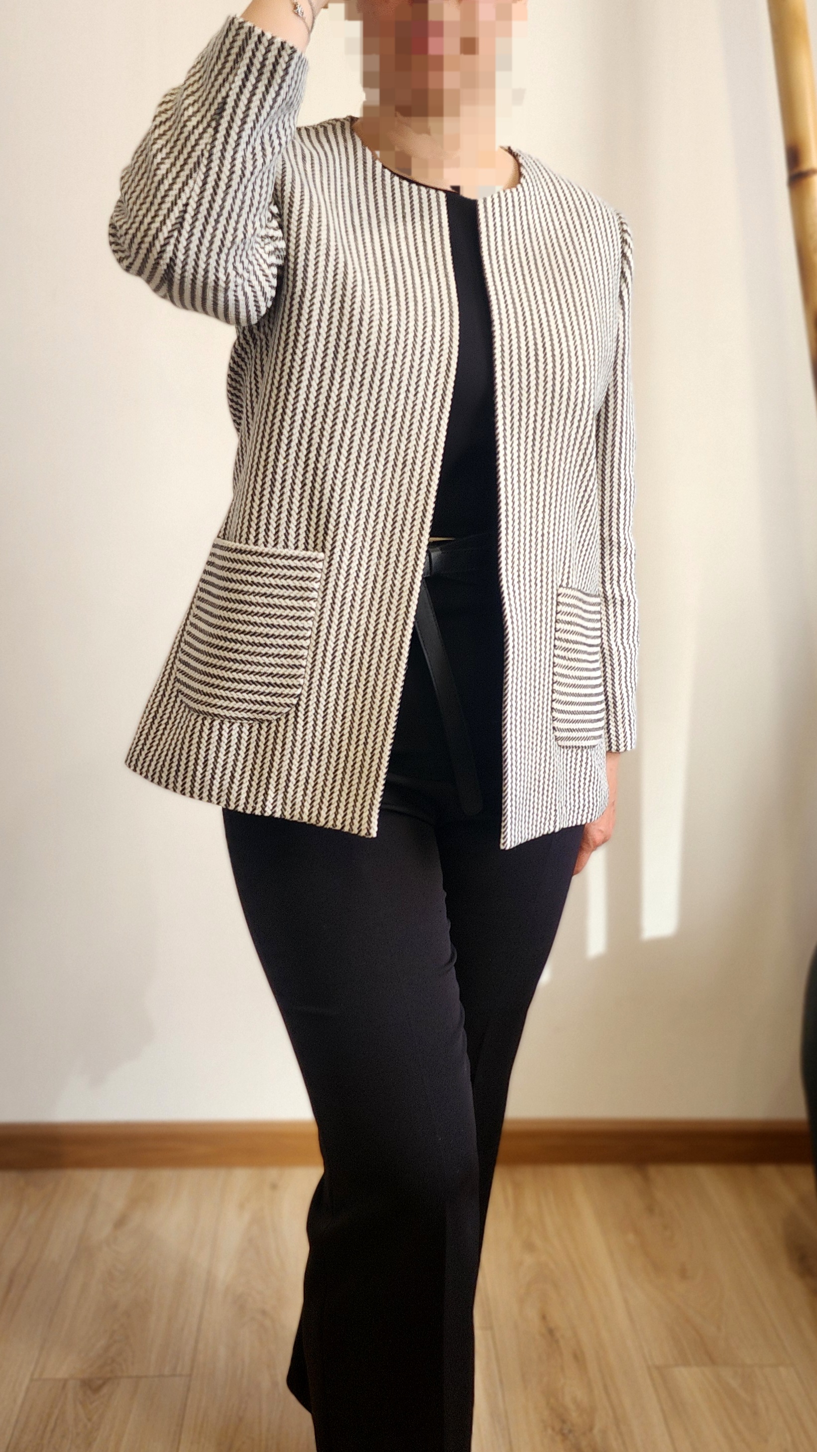 ▪️مدل بدون یقه کلاسیک و خطوط تمیز آن، این کت را به انتخابی مناسب برای استایلهای رسمی، نیمهرسمی و روزمره شیک تبدیل میکند.